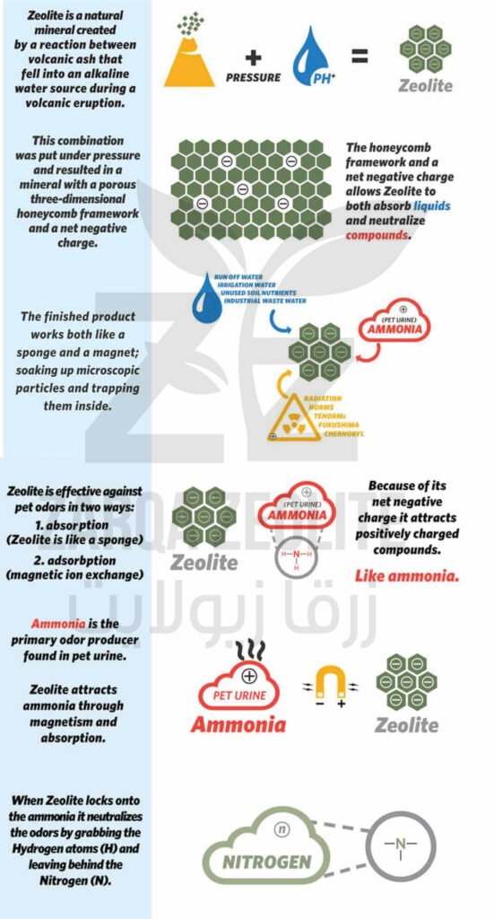 Zeolite is a type of natural mineral and rock, formed by the decomposition of volcanic rocks and their interaction with alkaline waters. It forms unique crystals in shape and properties from aluminum silicates, known as “molecular sieves.” These minerals are characterized by a low specific gravity, due to the presence of voids that constitute 35% to 50% of the crystal volume. Zeolite has a three-dimensional lattice structure resembling honeycomb, composed of layers with interconnected channels and voids where positive ions and water molecules are concentrated.